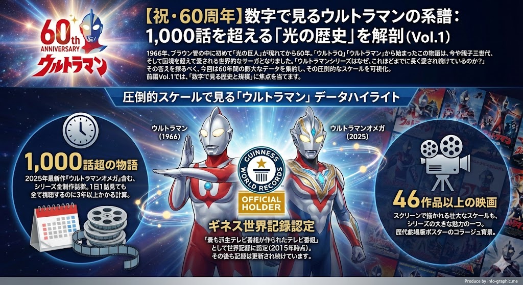 インフォグラフィックの冒頭で目を引くのは、ウルトラマンシリーズが積み上げてきた圧倒的な数字です。初代ウルトラマンと、2025年の最新ヒーロー・ウルトラマンオメガが並び立つ姿は、60年という長い歴史の架け橋を象徴しています。