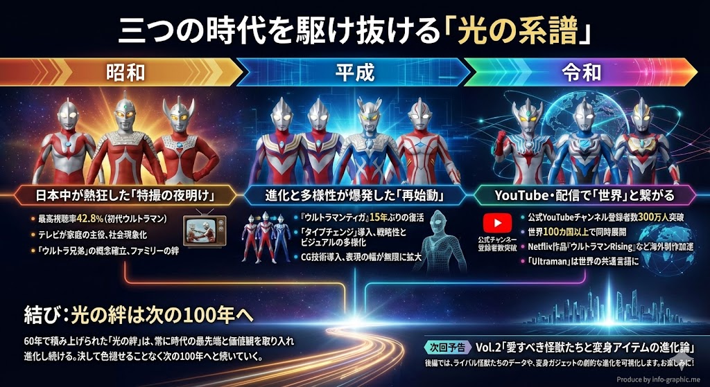 60年の歴史は、大きく「昭和・平成・令和」の三つの時代に分けられます。それぞれの時代が持つ空気感と、ウルトラマンがどのように進化してきたのかを、次のインフォグラフィックで紐解いていきます。