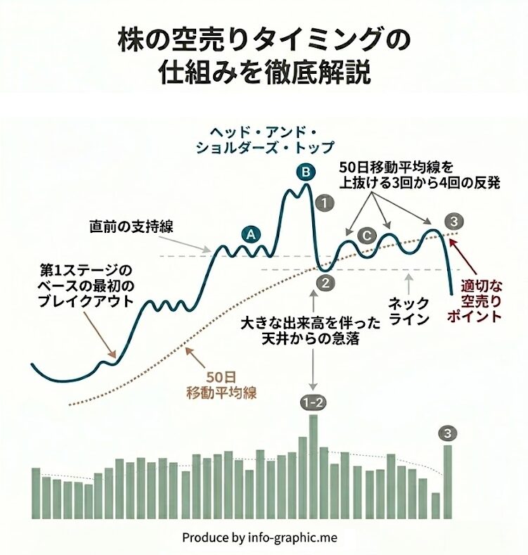 この図は、その「下がる」予兆を非常に強力に示すとされる、「ヘッド・アンド・ショルダーズ・トップ」というチャートパターン(頭と肩の形)の見分け方と、それを活用した空売りの決定打となるポイント(赤いポイント)を解説します。